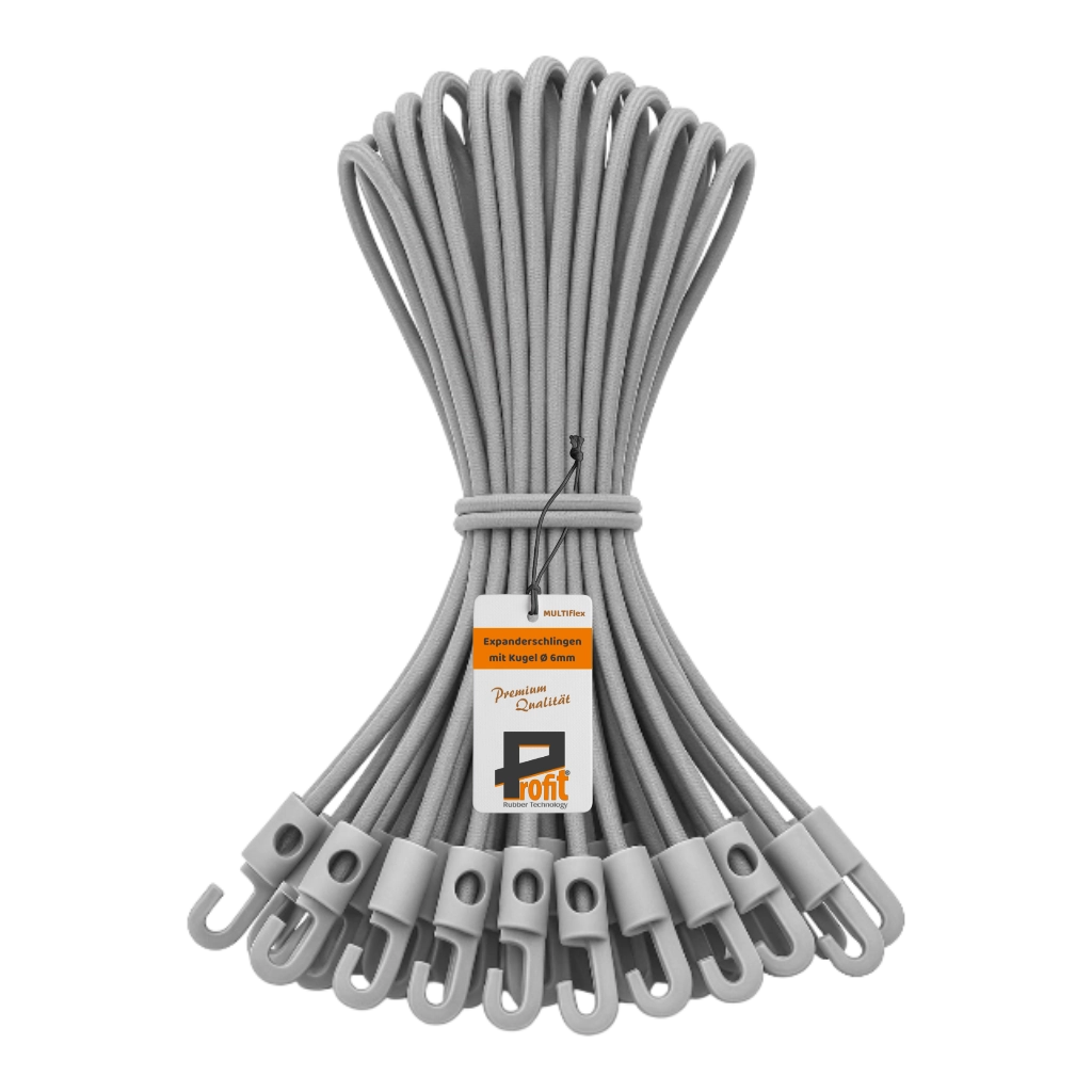 Expander hooks are the proven solution when it comes to flexible and secure fastenings. They consist of elastic rubber rope and a robust plastic hook. Typical are the gray expander slings with a diameter of 4 mm, which are available in lengths of 130 mm, 180 mm, 200 mm, 230 mm and 250 mm. These dimensions cover almost all areas of application, from small covers to large banners.